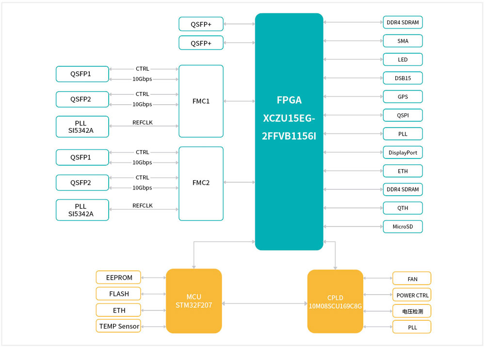 ·FPGA的PL侧支持24组10·3125G SerDes,都接到QSFP高速连接器上。